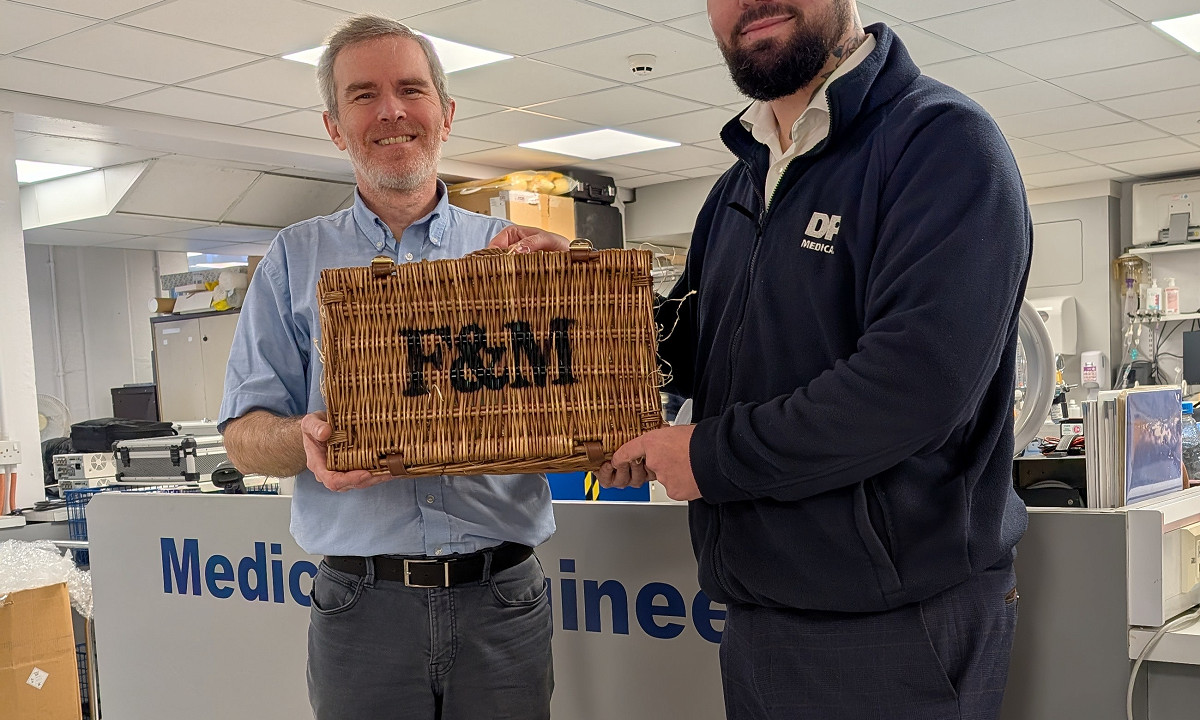 Jacob Bowers, field installation engineer at DP Medical, presented James with his prize in person – a luxury Fortnum and Mason hamper.